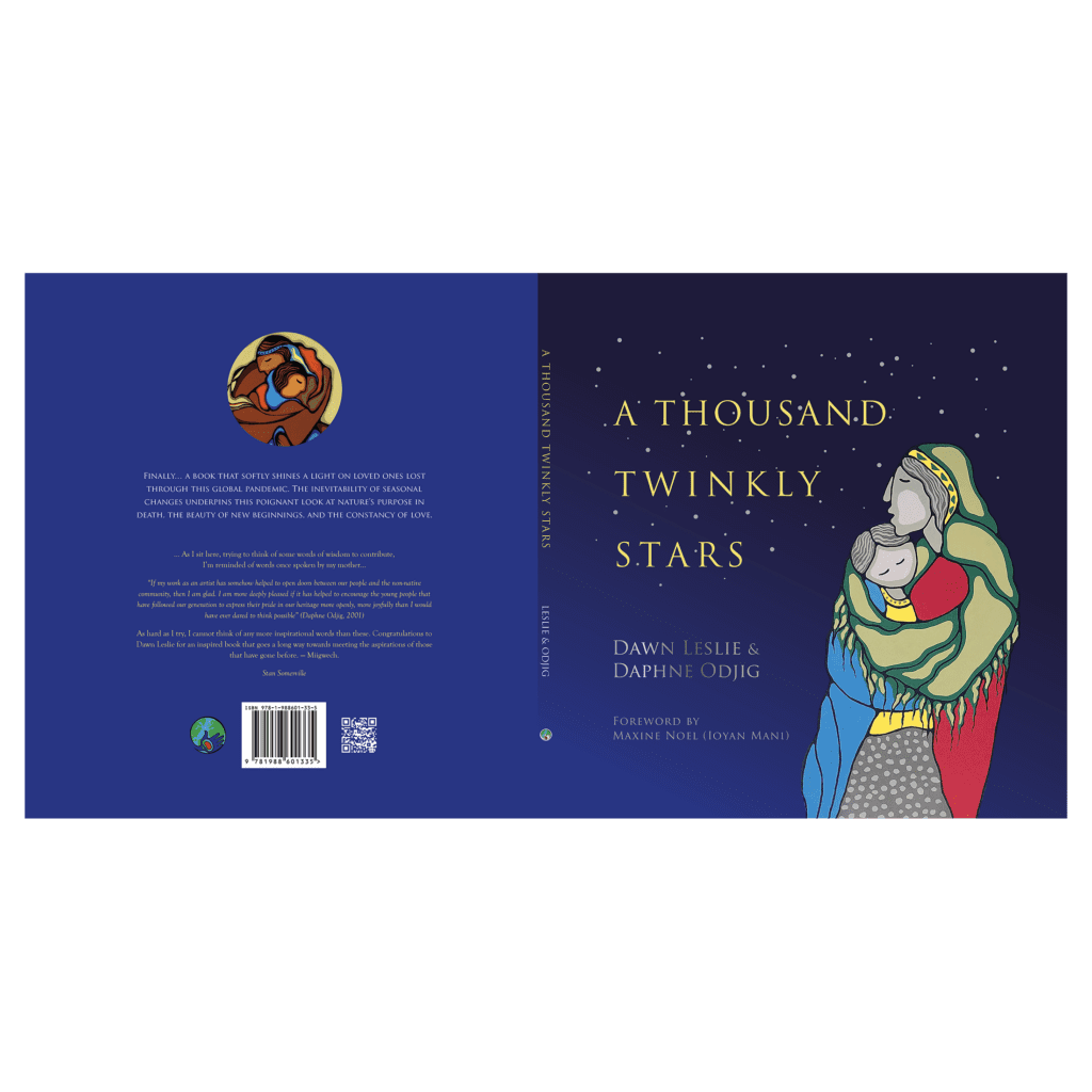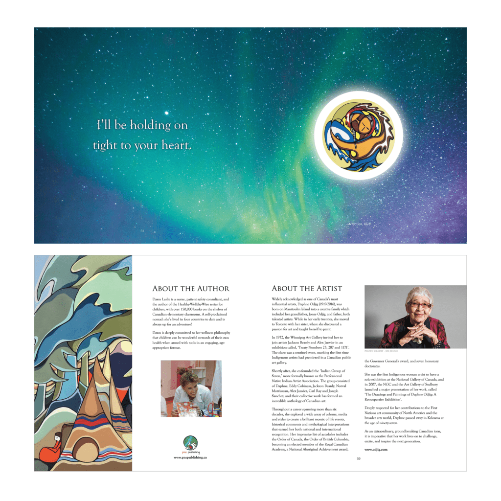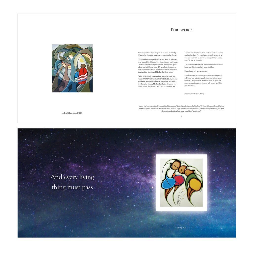 Story and publishing by Dawn Leslie, and art from the collected works of Daphne Odjig. Foreword by Ioyan Mani. Published by Paz Publishing, Printing by Friesens. “A book that softly shines a light on loved ones lost during this global pandemic. The inevitability of seasonal changes underpins this poignant look at nature’s purpose in death, the beauty of new beginnings, and the constancy of love.” The design goal was to sit somewhere between a children’s book and an art book. Something that would speak to children and adults. With the beautiful artwork of Daphne Odjig this was easy work.