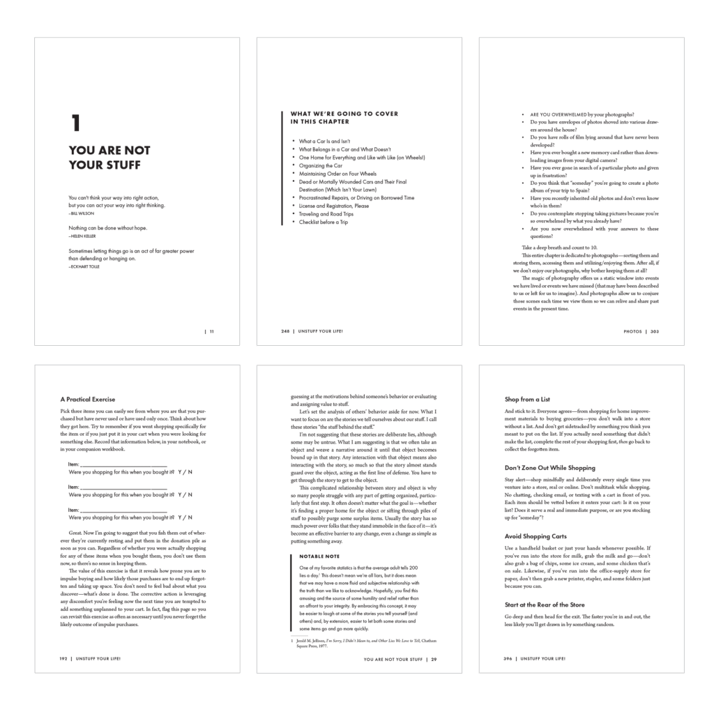 Andrew Mellen came to us to rebuild the second edition of his best selling book from the ground up: new cover, new interior design. Some of the key asks for the new cover includes: maintain a relationship to the previous cover, and communicate that the book was not just about organizing your closet. So, we kept the colour palette and grid-like layout of the first edition but brought more white into the cover to feel clean and airy (like your home when you’re done!). Then we moved away from a single closet image: bringing in images from kitchens, offices, etc. We also added a zen-like person alluding to your peace of mind once you’ve implemented Andrew’s methods. For the interior, we also wanted a lighter, easier to read presentation, and we wanted it to be well organized and easy to flip through — again reflecting the end goal for the reader’s life.