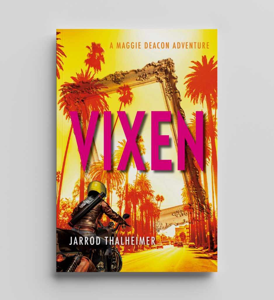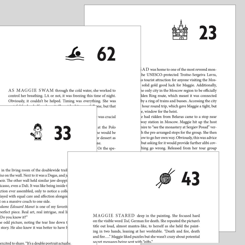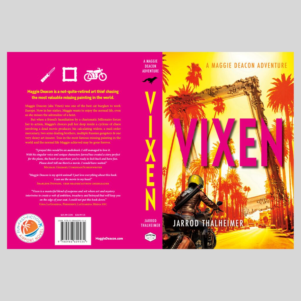 I had so much fun designing and project managing this book! We wanted a cover that said summer read, adventure, LA, and maybe a little bit Tarantino. Also one that showed our unique heroine – a retired art thief. For the interior design I suggested adding a teaser illustration for each chapter — which really brought some fun to the book — picking out a quirky detail or event from each chapter for it. I then chose a trio of the chapter graphics to represent the entire story on the back cover and title page, creating a cohesive overall design. They will also be fun for the author to use in the book marketing — along with the hot pink, yellow, orange colour palette!